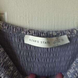 Romantic and effortlessly boho, this Altar’d State smocked babydoll dress features a soft lavender floral print, a stretchy smocked bodice, and tiered skirt for a flattering flowy fit. Puff sleeves with elastic cuffs complete the cottagecore vibe — perfect as a mini dress or tunic over leggings.