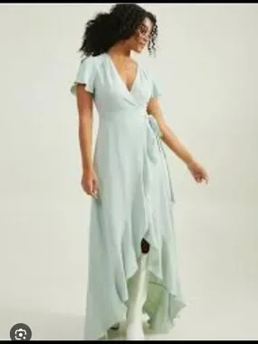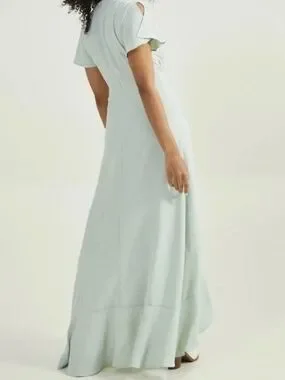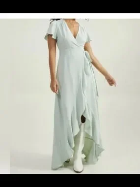 Elegant light sage wrap maxi dress with a flattering V-neck and short sleeves. Soft, flowing fabric and a tie waist create a feminine silhouette. Subtle high-low hem adds movement for day or evening wear. Includes the identified color in the design for a fresh, versatile look.