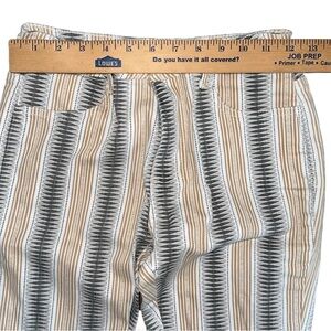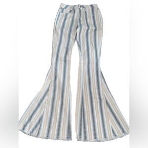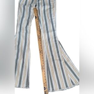 Stylish flare pants with a striped pattern. Features blue and tan colors. Perfect for a chic, boho look.