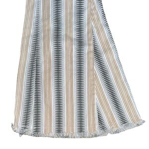 Stylish flare pants with a striped pattern. Features blue and tan colors. Perfect for a chic, boho look.