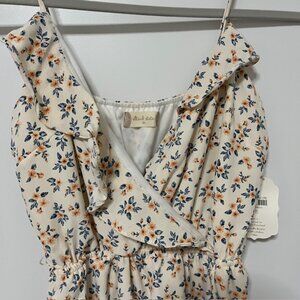 Altar 'state Sundress with high low ruffled hem. Cream background with blue and peach flowers. Ruffled at the neckline. Fully lined, Dress Rayon and lining polyester. Adjustable straps.