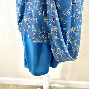 This beautiful Altar'd State dress is perfect for any summer or spring party or cocktail event. The baby blue floral pattern is stunning, and the dress is made of a silk blend material that is both comfortable and sheer. The ruffle accents and flutter sleeves add a touch of femininity, while the round neckline and pullover closure make it easy to wear.