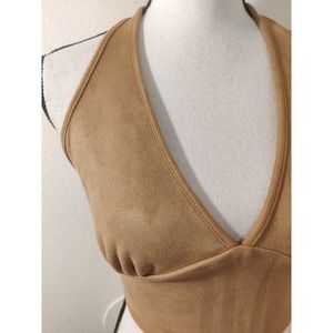 Altar'd State Tan Faux Suede Halter Tie Back Pointe V-neck Cropped Top Size L