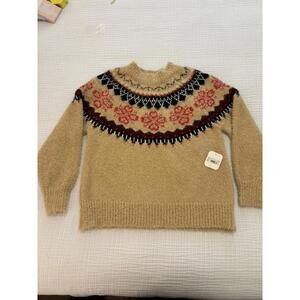 Cozy tan sweater featuring a colorful patterned yoke design in red, black, and white. Soft, fuzzy texture ideal for cooler weather. Crew neckline and long sleeves with ribbed cuffs and hem for a snug fit. New with original tags attached.