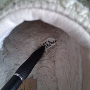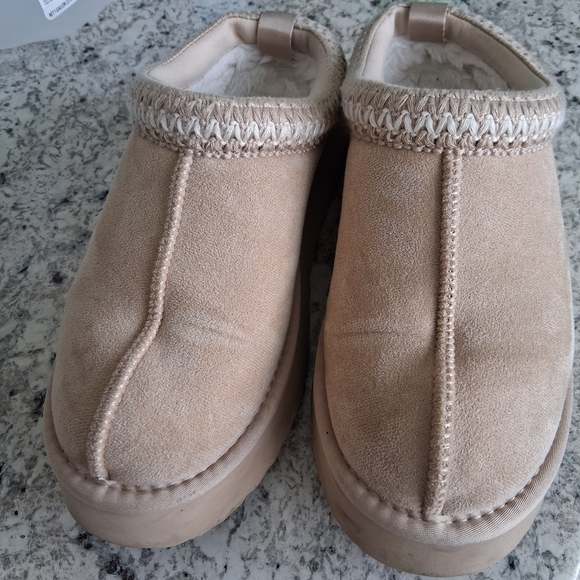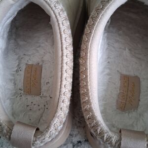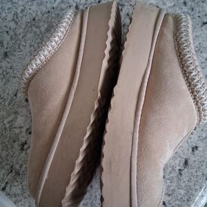 Cozy tan slippers with soft lining. Stylish woven trim. Perfect for comfort. Still PLENTY of life left!