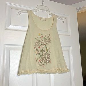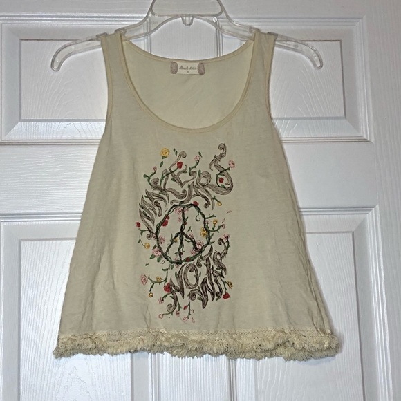 Super cute tank from Altar’d State. NWOT. Says “make art, not war” made with very soft material and has little frizzies at the bottom. Size XS. 55% cotton 45% modal