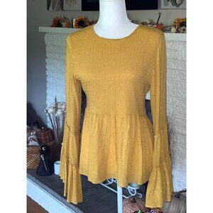 Fun mustard boho pullover top, back button, stretchy smocked bodice, ruffle skirt, unique romantic tiered ruffle long bell sleeves. Info tag cut; texture small tufts fabric feels like rayon.