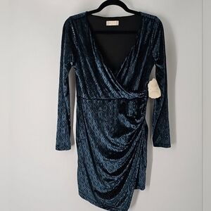 Altar'd State Turquoise Dress w Blk Burnout Design Asymmetric Hem Rusched Waist