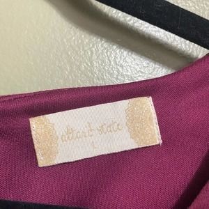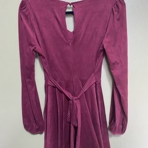 Burgundy romper by Altar’d State, size large. Velvety material, long sleeve with elastic wrists and tie back waist. Gathered material at top of sleeve where it meets the shoulder. Zip up back with a button closure on top