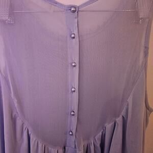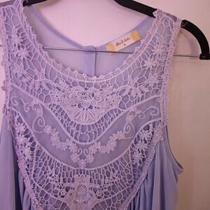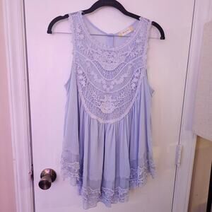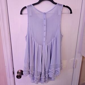 Altard State Whimsy Lace Tank. Layered lace bottom hem. Pearl button on sheer back. Light blue in color.