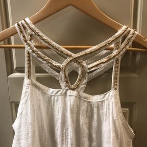 **๐ต๐พ๐ป, ๐ต๐ฌ๐ฝ๐ฌ๐น ๐พ๐ถ๐น๐ต** This white, flowy halter neck top with tan beaded detail is perfect for this spring! This top has been sitting in my closet and is looking for a new wardrobe to call home. It is one of my favorite pieces to look at but it no longer reflects my style. It is a lightweight fabric and has an extra layer underneath so it is not see-through. The front and back pretty much mirror each other and there is beading on both the front and the back. Price is set, but possibly willing to negotiate :)