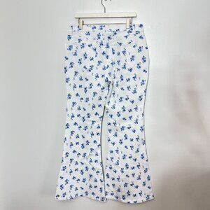 floral pants, white blue pants, flared pants, casual pants, Altar'd State pants, cotton blend pants, women’s fashion, boho style pants, comfy flares, floral print bottoms, XL flared pants, lightweight trousers, trendy flares, ERL, Revolve