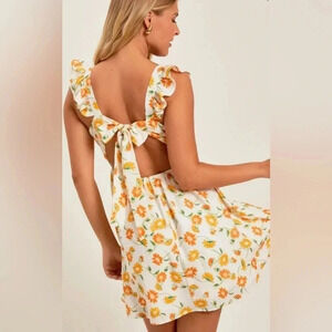 Elevate your wardrobe with this new Altar'd State Della Mini Dress, featuring a delicate yellow floral pattern on a crisp white background. The mini dress has a flattering A-line silhouette.
