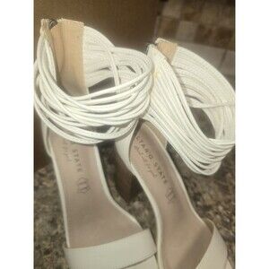 Excellent new condition, never worn. Soles clean, minimal signs from storage only. Genuine leather footbed, stacked wood heel, and strappy zip-back style for an effortlessly chic look.