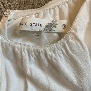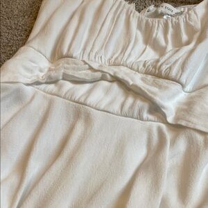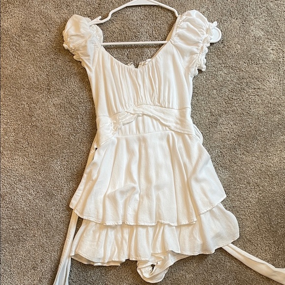 Charming white chemise with ruffled layers. Puff sleeves add a playful touch. Perfect for a cozy night in. The white ribbon ties to a bow in the back of the dress