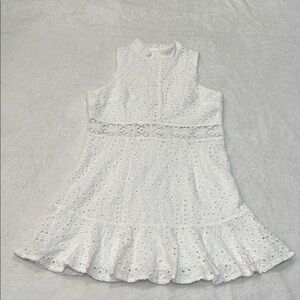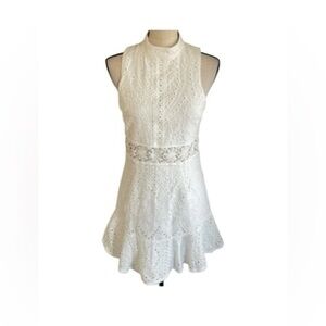 This stunning mini dress by Altar'd State features a sleeveless design with a mock neck and Mandarin collar, ideal for a bride or wedding guest. The white fit and flare silhouette is beautifully complemented by a ruffled, tiered skirt that adds a playful touch. Its intricate fabric texture enhances the dress's sophisticated and timeless charm.