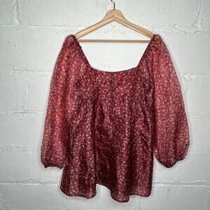 Altar'd State Women's Empire Babydoll Balloon Sheer Sleeves Ditsy Print Floral Janey Dress Burgundy Size Medium