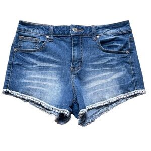 Altar’d State Women’s Blue Denim Shorts Size 27 Raw Hem Crochet Detail Stretchy