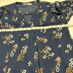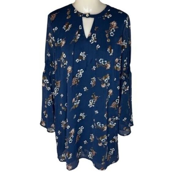 This dress is good preowned condition. Bell sleeve. Blue floral print. Knee length. Lined. Keyhole. Size Small