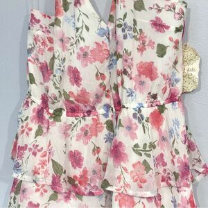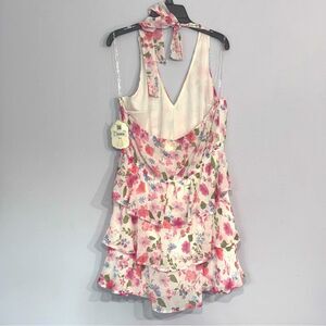 Charming floral dress with pink and blue flowers. Features a tiered ruffle design and halter neckline. Perfect for spring and summer.