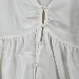 This Altard State blouse captivates with its soft, feminine design featuring a delicate peplum hem, flutter short sleeves, and a flattering V-neckline. The blouse is accentuated by button-front details and a gathered bodice that adds texture and shape. Designed with comfort and style in mind, this lightweight blouse is fashioned from 100% polyester for a soft yet durable touch. Its versatile bright white tone makes it suitable for both casual outings and semi-formal occasions. Pair it with your favorite jeans, trousers, or skirt to complete the look. The garment is easy to maintain with care instructions that include hand washing in cold water. With medium sizing, it offers a balance of comfort and elegance, creating a wardrobe staple with a chic yet simple aesthetic.