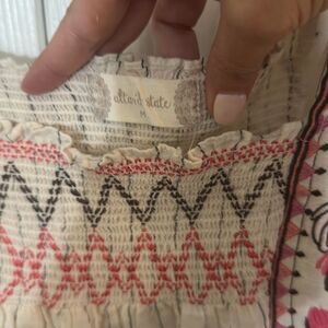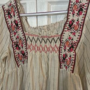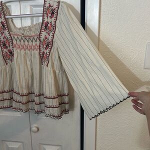 Altar'd State Women's Striped Smocked Embroidered 3/4 Sleeve Peasant Blouse Ecru Medium