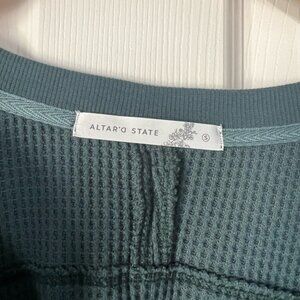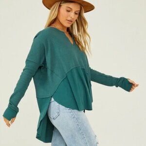 Altar’d State Women’s Teal Waffle Knit Split Neck High Low Top Thumbholes S