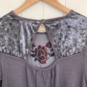 Pullover round neck blouse with button closure at back of neck, cut out on upper back, multi-media fabric including gauzy cotton and velour/velvet on front and t-shirt type material on part of front, back and sleeves, layered bell cuff, embroidered floral print around chest/neckline, dark grey with red, orange and black embroidery, so cute for multiple seasons.