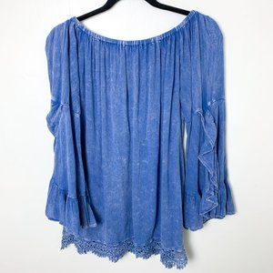 Altar'd State blue boho off the shoulder swing blouse with bell split sleeve in size medium. Lace trim on bottom edge