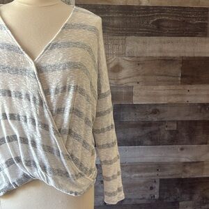 This Altar’d State sweater has white and silver stripes. The front is draped with faux wrap look and it offers batwing sleeves. The materials tag was cut out during previous use. It is gently worn and is in excellent condition!