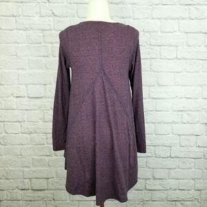 Altar'd State top in a heather purple. It is a long sleeve, scoop neckline loose fitting tunic top with a beaded neckline. It has a high low hem.