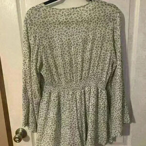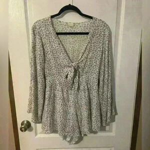 Super cute romper with a white and grey leopard print great piece of transitioning into fall! The lining underneath is tore I pictured it above but you do not see it when wearing the romper!