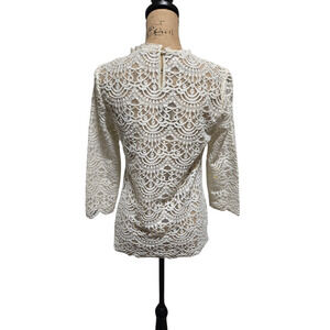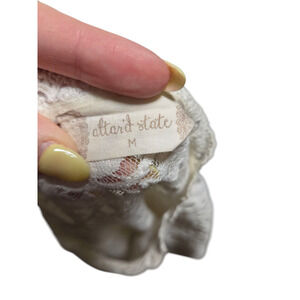 This Altar'd State white lace top in size medium features a high collar and intricate lace detailing for an elegant, vintage-inspired look. The delicate fabric and refined design make it perfect for dressy occasions or layering under jackets and sweaters. Its timeless white color and feminine silhouette add sophistication and charm to any outfit.
