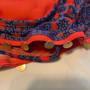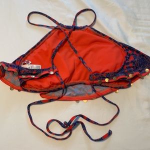 Orange/pink, blue, and purple patterned bikini top with gold coin embellishments. Strappy back
