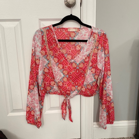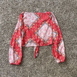 It’s a cropped blouse but isn’t extremely short. When I tried it on it came to just below my belly button, so it would go really well with some high waisted jeans!