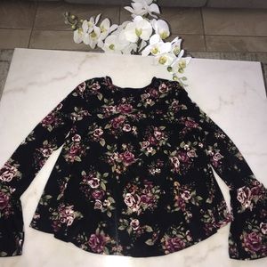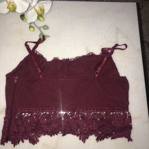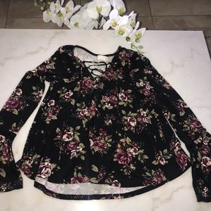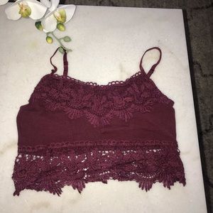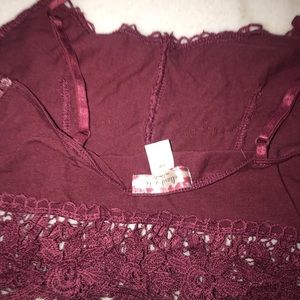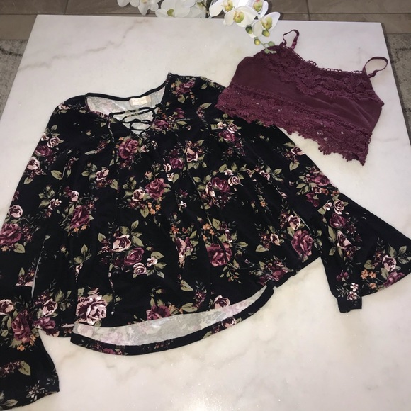 This is a cute burgundy crop that can be used by itself or as a brallete, paired with a black altard state long sleeve. The black top has flowers and ruffles on the end of sleeves and the bottom of the shirt. Also has a laced up design in the top front part as seen on the pics. Both in really good condition maybe worn once.