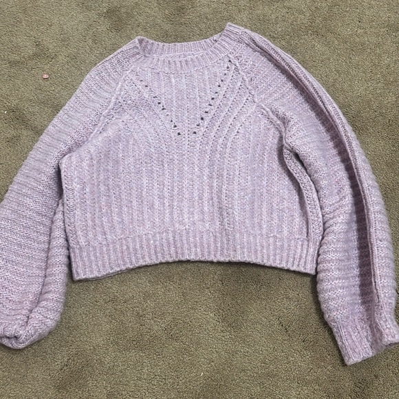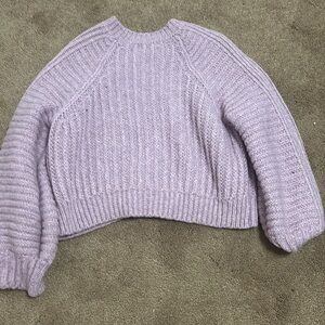 This is a purple sweater that has been worn once.It was in a smoke free house hold but we do have dogs.