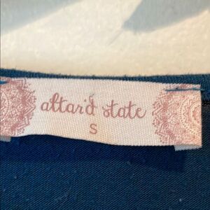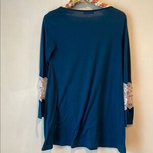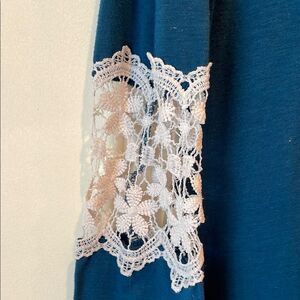 Elegant blue/green dress from Altar'd State. Versatile and chic.with cream colored lace on sleeve, preowned good condition, cotton blend, could be used as dress or long top