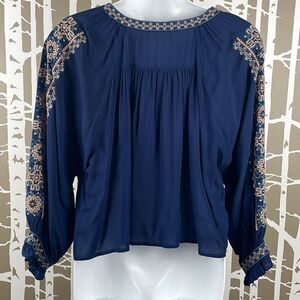 Altar’d State Cropped Boho Embroidered Blouson Sleeve Blouse S Navy Blue