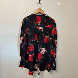 Size medium. Altar’d State black tunic blouse featuring bold red floral patterns. Ideal for stylish outings.