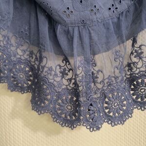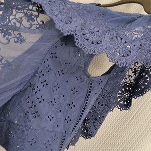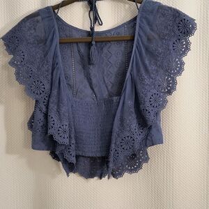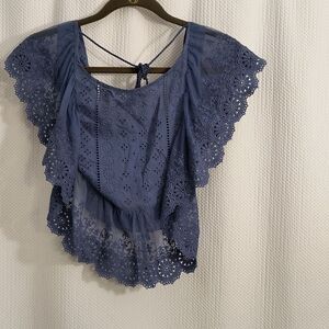 Blue crop lace with scalloped sleeves and bottom. Super cute. Pit to pit approx 16. Great pre-owned condition.