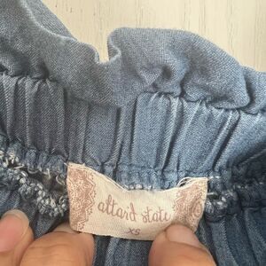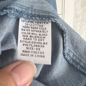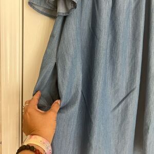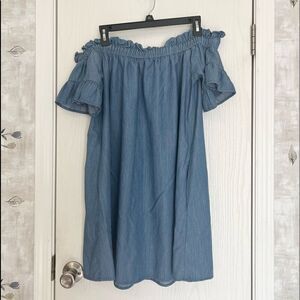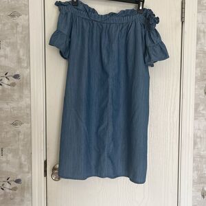 This chambray dress is in excellent preloved condition . It is elastic at neck line and can be worn off shoulder , ruffled sleeves , and has pockets . It sits just above the knee .