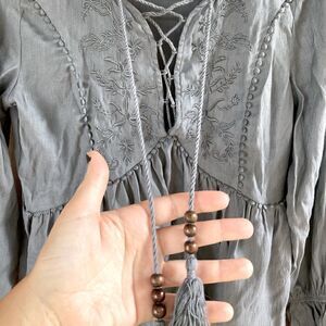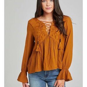 This empire silhouette top is complete with beautifully floral embroidery and lace up tassel details! it’s the perfect addition to your fall wardrobe!