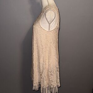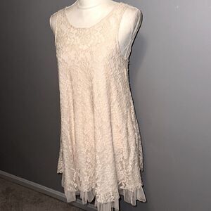 Beautiful sleeveless lace lined swing dress from Altar’d State! Such a pretty and romantic dress, off white, light weight for summer, dress down with a jean jacket, Mesh tule bottom.Zip up back.