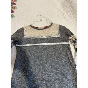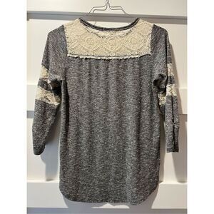 Excellent condition. Beautiful gray top with lace at top and lace bands on the sleeves. Size M. Approx measurements across chest 17” length 24.5” front 28” back