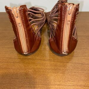 Woman’s size 7. Mason style. Brown leather. Wear on bottoms but otherwise great condition no flaws on top