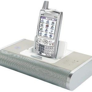 This sharp looking speaker dock was originally designed for Palm PDA/Phone devices, but also has a mini audio jack input to work with any other phone or audio device (MP3, CD, DVD, etc) with audio out jack (mini audio cable included).
