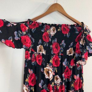 Alter’d State Maxi Dress S Black Red Rose Floral Smocked Off The Shoulder Boho