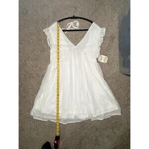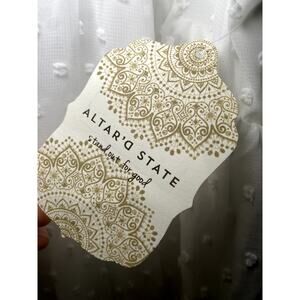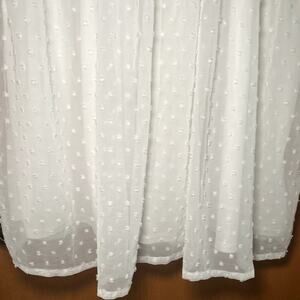 Beautiful white dress from Altar'd State featuring delicate ruffle details and a playful polka dot sheer fabric. This dress offers a flowy and flattering silhouette. The back tie adds a touch of elegance and adjustability for a perfect fit.