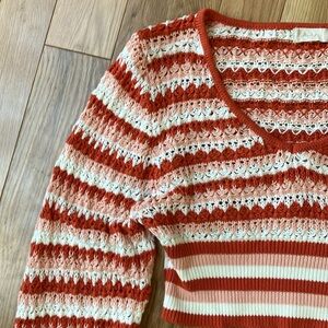 Alter’d State crochet cropped sweater! Long puff sleeves. Banded cropped waist. Rounded V-neck striped! Super stretchy if needed! Fits me as a 1X.